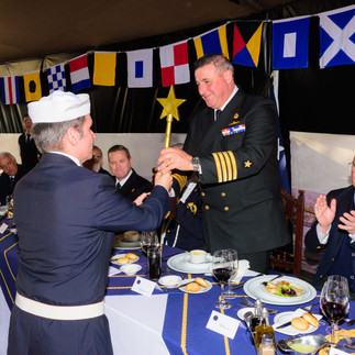 Después de los fraternales saludos a la tripulación y de la entonación de nuestro Himno Nacional, el Presidente de la Corporación Caleuchana y Comandante del Buque Madre, Almte. Roberto Macchiavello Marcelí, hizo su discurso oficial. (Discurso completo en la Revista El Compás)